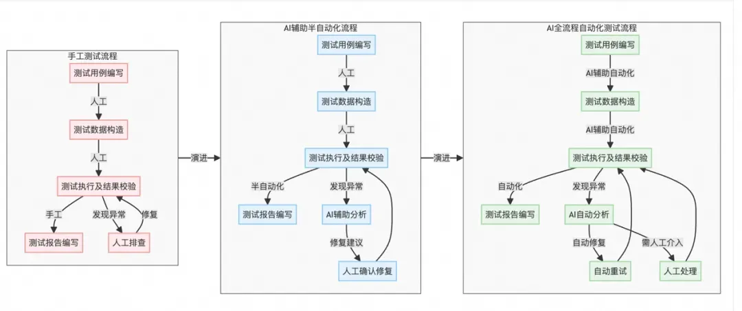 2. AI辅助半自动化 → AI全流程自动化:在交易链路测试的探索及实践的过程中,AI辅助的半自动化阶段,虽然数据构造与校验效率已提升,但测试用例的设计由人工设计。