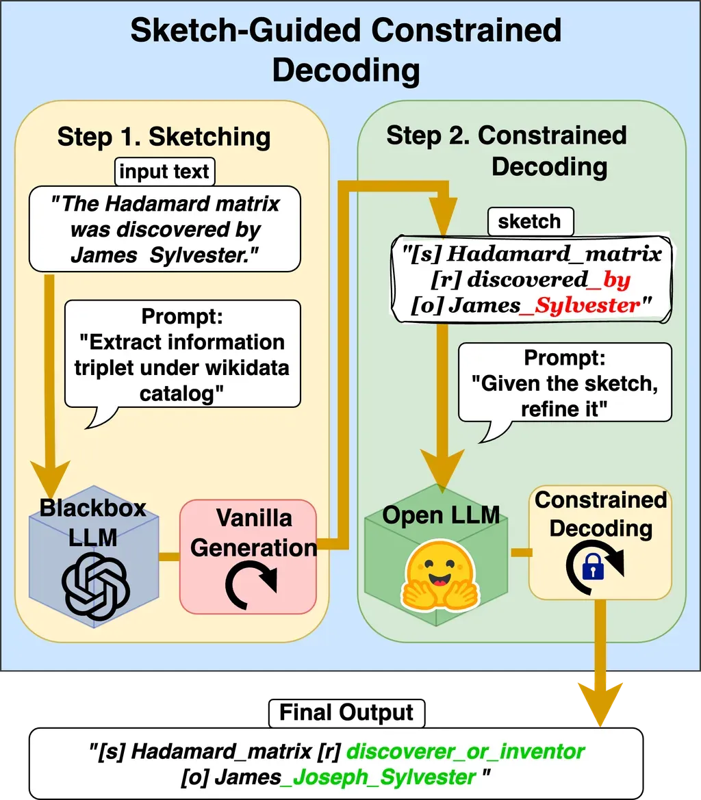 这种技术上的限制促使了新的解决方案的出现。例如,由Saibo Geng等人在ACL 2024年提出的“草图引导约束解码”(Sketch-Guided Constrained Decoding, SketchGCD)方案。该方法旨在解决无法访问logit的黑盒LLM的约束解码问题。其核心思想是,将黑盒LLM的无约束自由文本输出视为一个“草图”(Sketch),然后利用一个本地部署的辅助模型,根据预定义的规则对这个“草图”进行精炼和修正。这种方法通过将“事中”干预巧妙地转化为一种“事后”的局部修正,成功地在不访问黑盒模型内部机制的情况下实现了约束解码的效果。