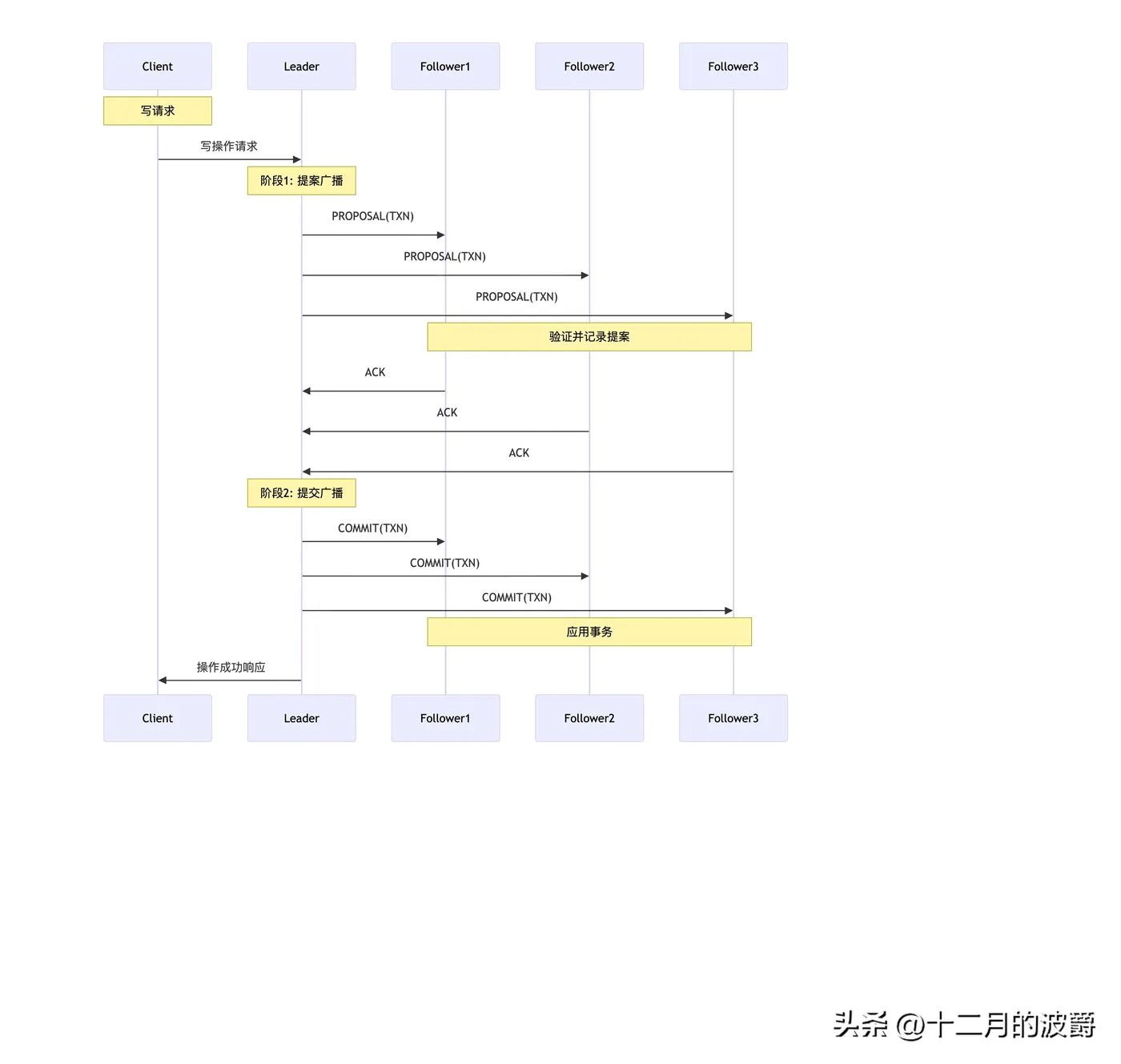 public class MessageBroadcast { // 事务ID(ZXID)结构 public class Zxid { private long epoch; // 选举周期(32位) private long counter; // 事务计数器(32位) // ZXID = (epoch << 32) | counter // 保证全局唯一且严格递增 } // 消息广播的详细流程 public class BroadcastProcess { public void broadcastTransaction(Transaction txn) { // 1. Leader为事务生成ZXID long zxid = generateNextZxid(); txn.setZxid(zxid); // 2. 将事务写入本地日志(WAL) writeToLog(txn); // 3. 广播PROPOSAL给所有Follower Proposal proposal = new Proposal(zxid, txn); for (Follower follower : followers) { sendProposal(follower, proposal); } // 4. 等待多数派Follower的ACK if (waitForMajorityAck(zxid)) { // 5. 多数派确认后,广播COMMIT broadcastCommit(zxid); // 6. 应用事务到内存数据库 applyToMemoryDB(txn); // 7. 响应客户端 sendResponseToClient(txn); } else { // 多数派未确认,操作失败 handleFailure(txn); } } } }
