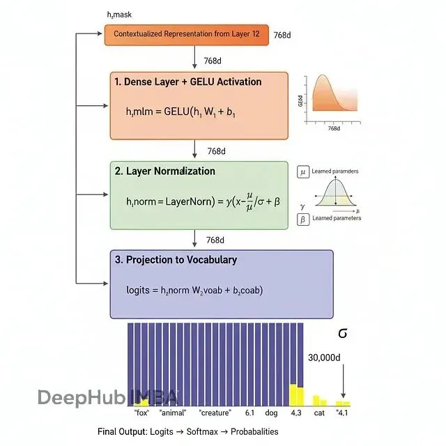 过完L层transformer(BERT-base是12层,BERT-large是24层)之后,每个token都有一个上下文化的表示h_i ∈ R^d。对于被掩码的token,需要把这些表示转成词汇表上的概率分布。