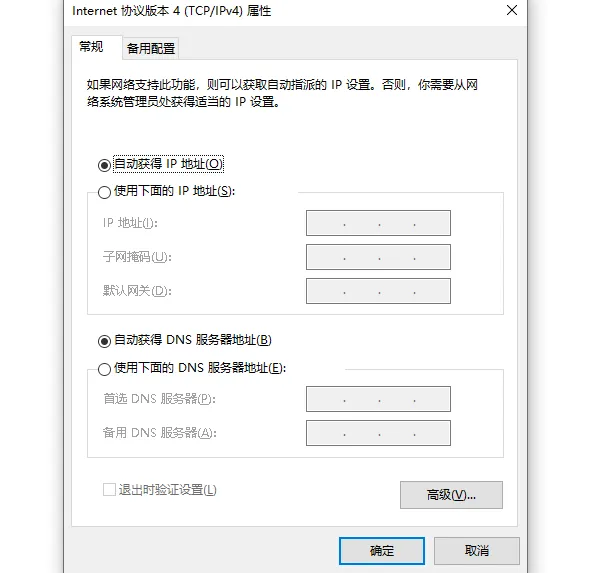 ④、确保勾选“自动获得IP地址”和“自动获得DNS服务器地址”。