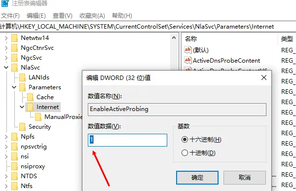 ③、修改EnableActiveProbing的值为1(如果不存在可新建DWORD值);