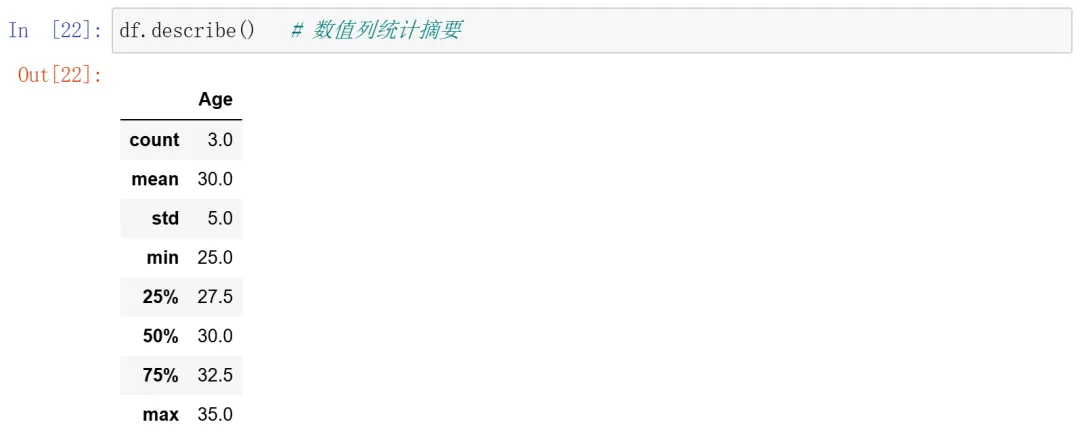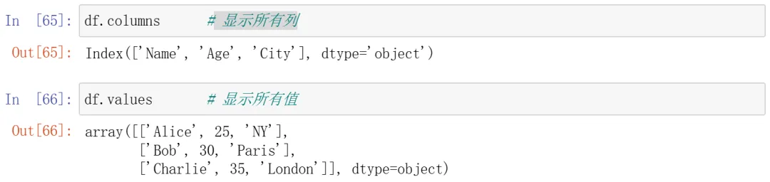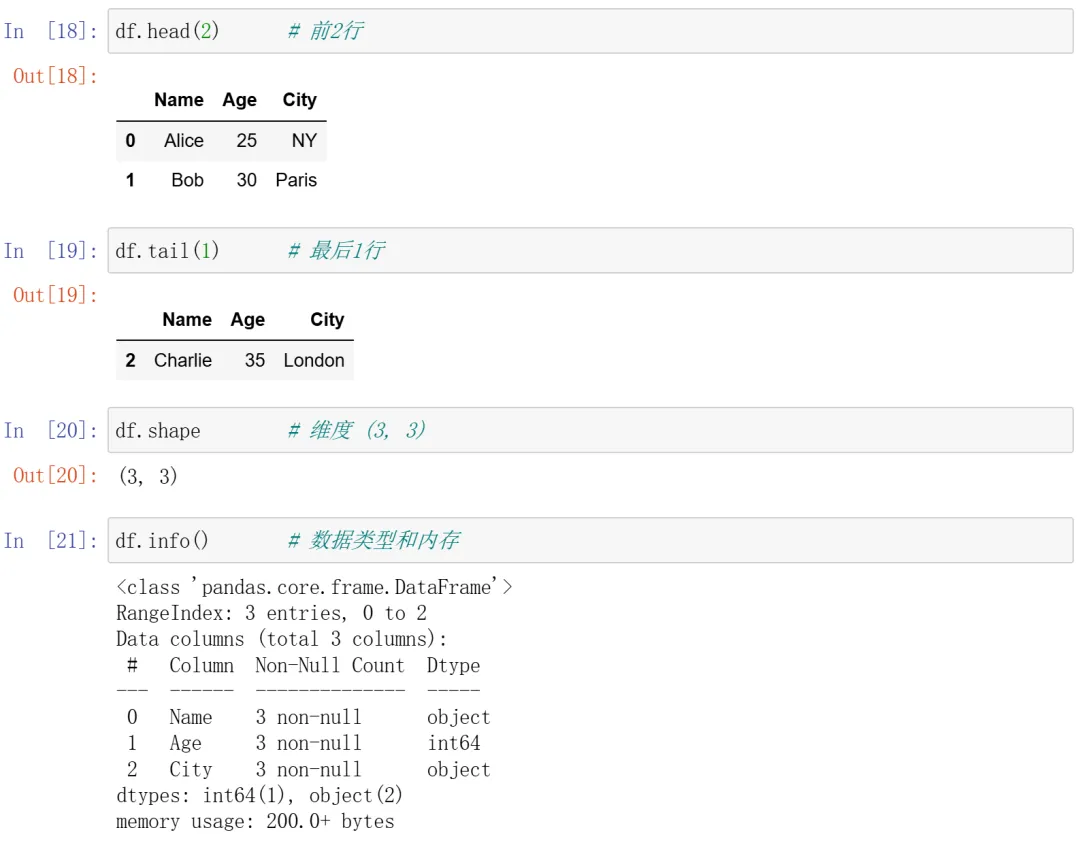 df.head(2) # 前2行 df.tail(1) # 最后1行 df.shape # 维度 (3, 3) df.info() # 数据类型和内存 df.describe() # 数值列统计摘要 df.columns # 显示所有列 df.values # 显示所有值