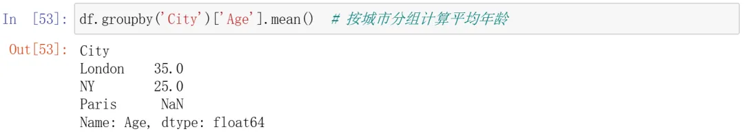 df.groupby('City')['Age'].mean() # 按城市分组计算平均年龄
