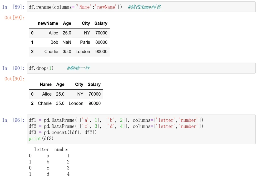df.rename() #重命名列名 df.drop() #删除行/列 pd.concat() #合并多个DataFrame df.merge() #数据库风格的合并