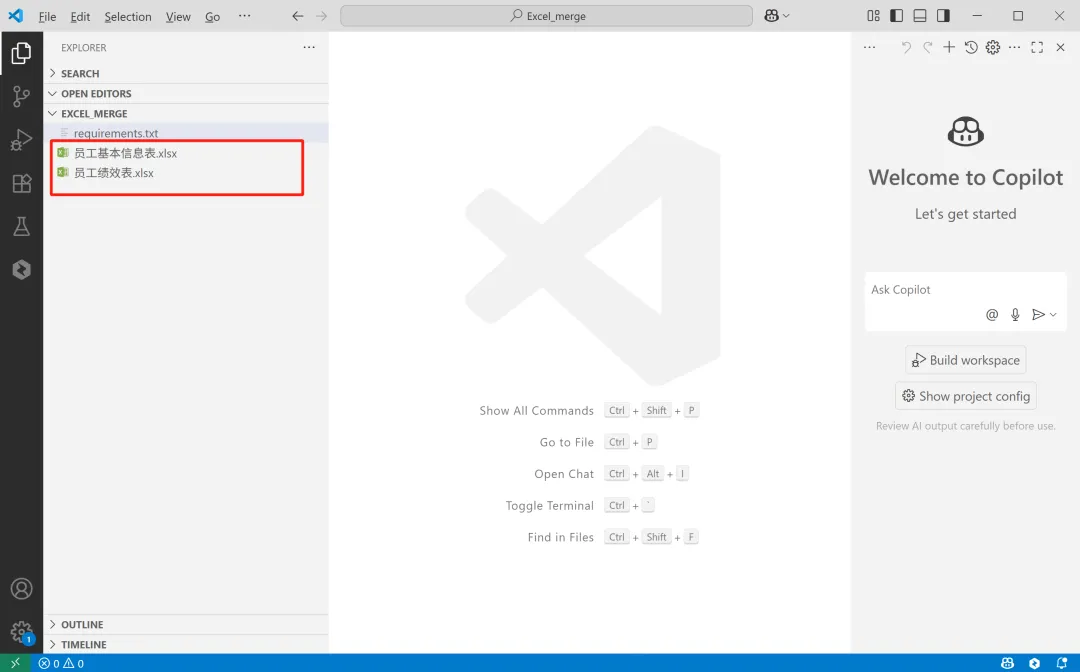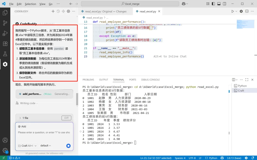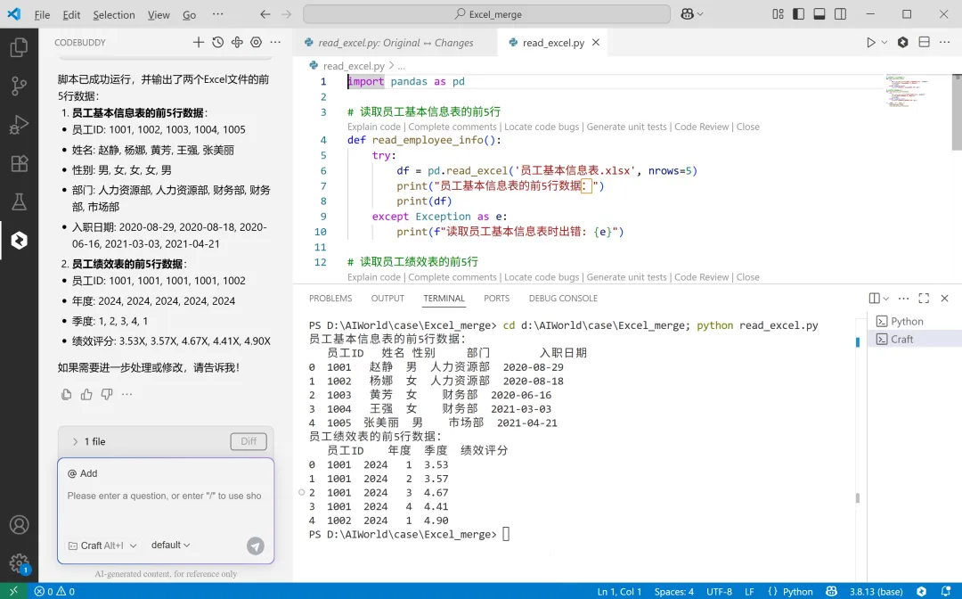 初步了解了Pandas的常规用法,下面结合CodeBuddy看一个Excel数据集的操作实例,项目中有两个Excel文档,分别是“员工基本信息表.xlsx”、“员工绩效表.xlsx”