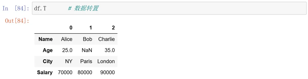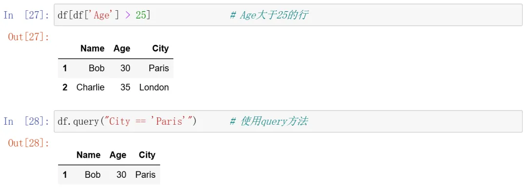 df[df['Age'] > 25] # Age大于25的行 df.query("City == 'Paris'") # 使用query方法