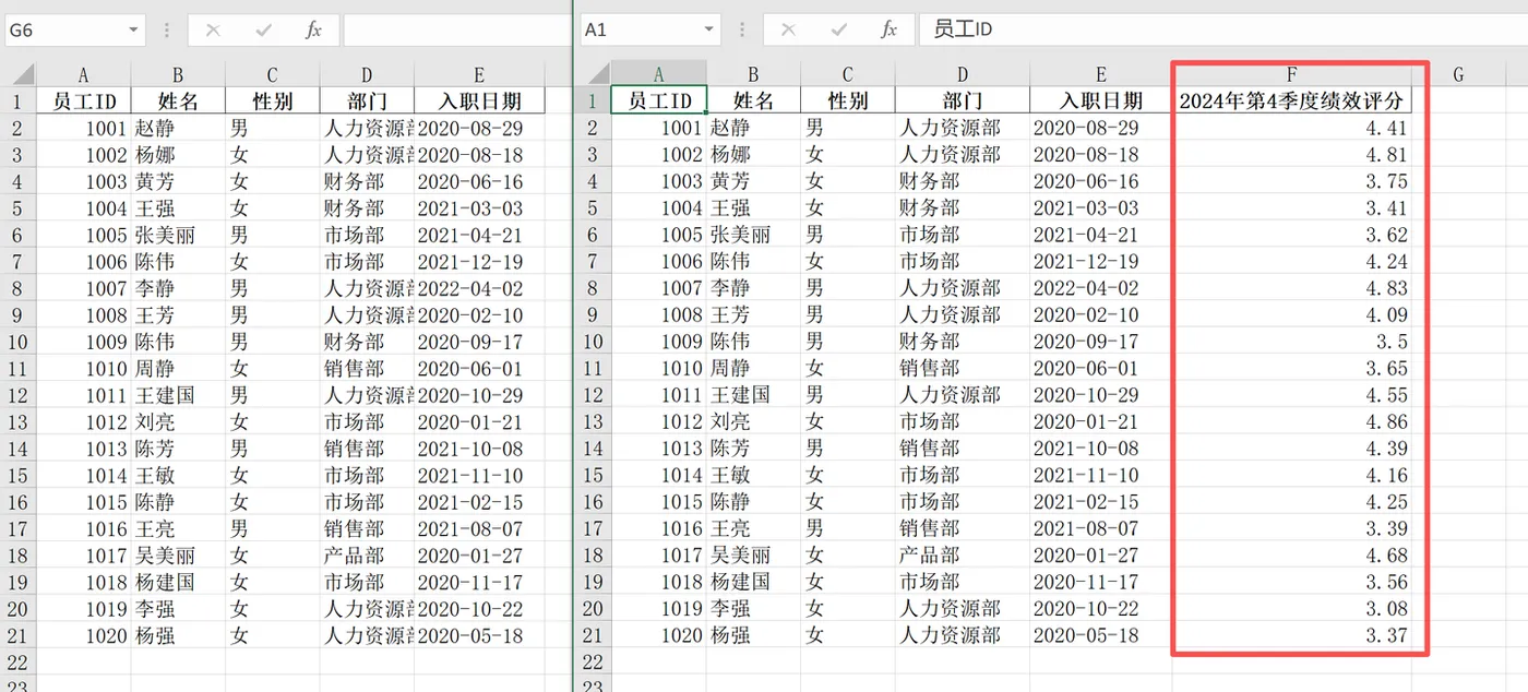 “编写Python,在员工基本信息表.xlsx 的基础上,增加该员工 2024年第4季度的绩效,存到新的 .xlsx”