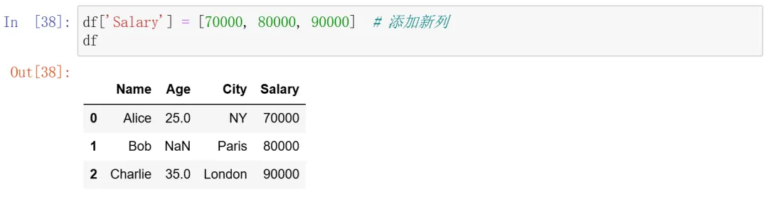 df['Salary'] = [70000, 80000, 90000] # 添加新列