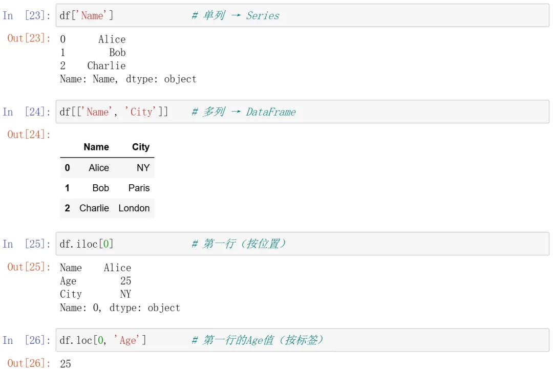 df['Name'] # 单列 → Series df[['Name', 'City']] # 多列 → DataFrame df.iloc[0] # 第一行(按位置) df.loc[0, 'Age'] # 第一行的Age值(按标签)