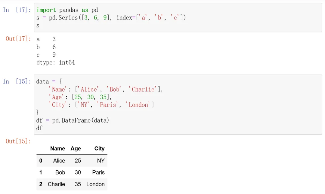 data = { 'Name': ['Alice', 'Bob', 'Charlie'], 'Age': [25, 30, 35], 'City': ['NY', 'Paris', 'London'] } df = pd.DataFrame(data)
