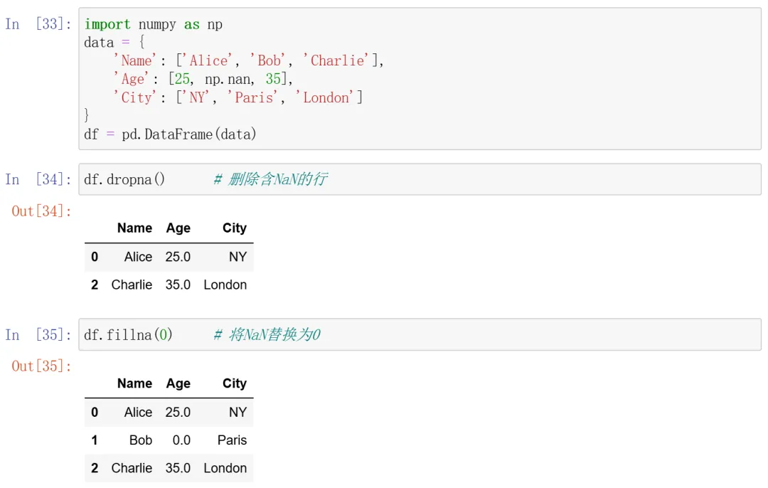df.dropna() # 删除含NaN的行 df.fillna(0) # 将NaN替换为0