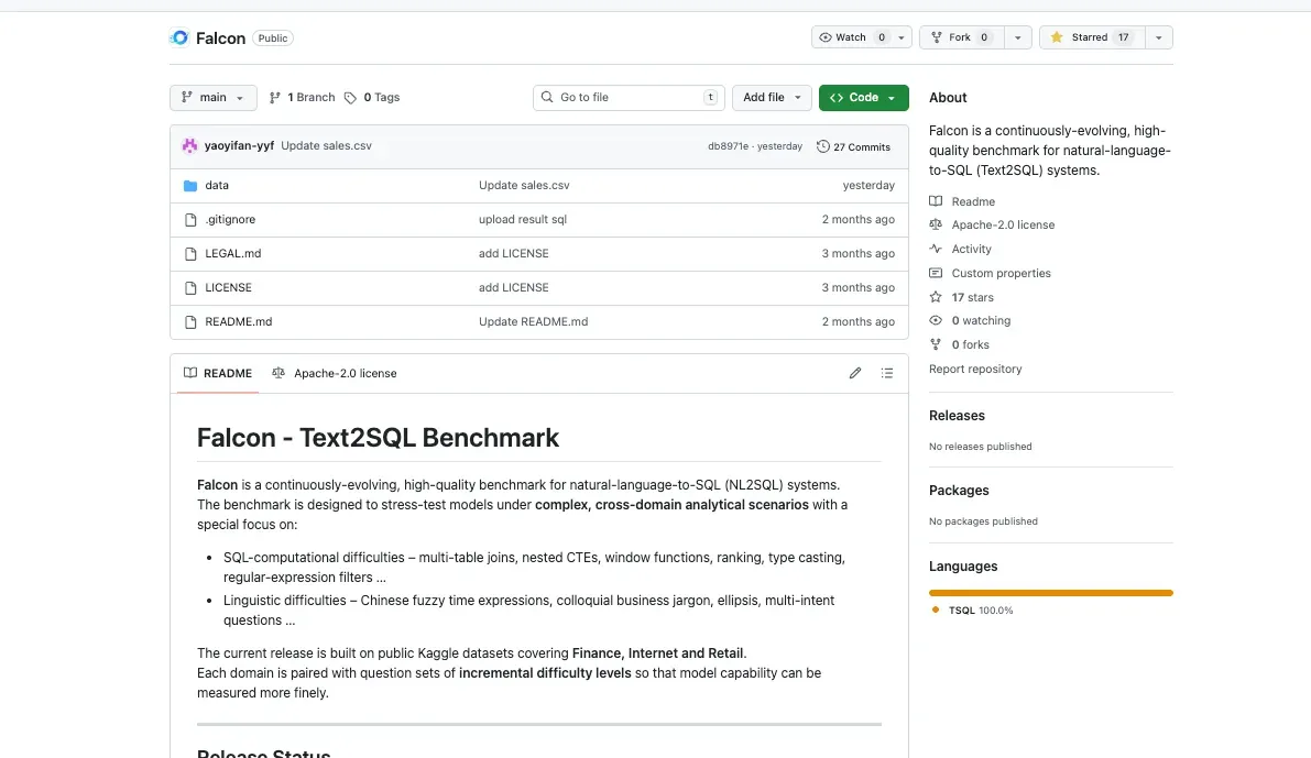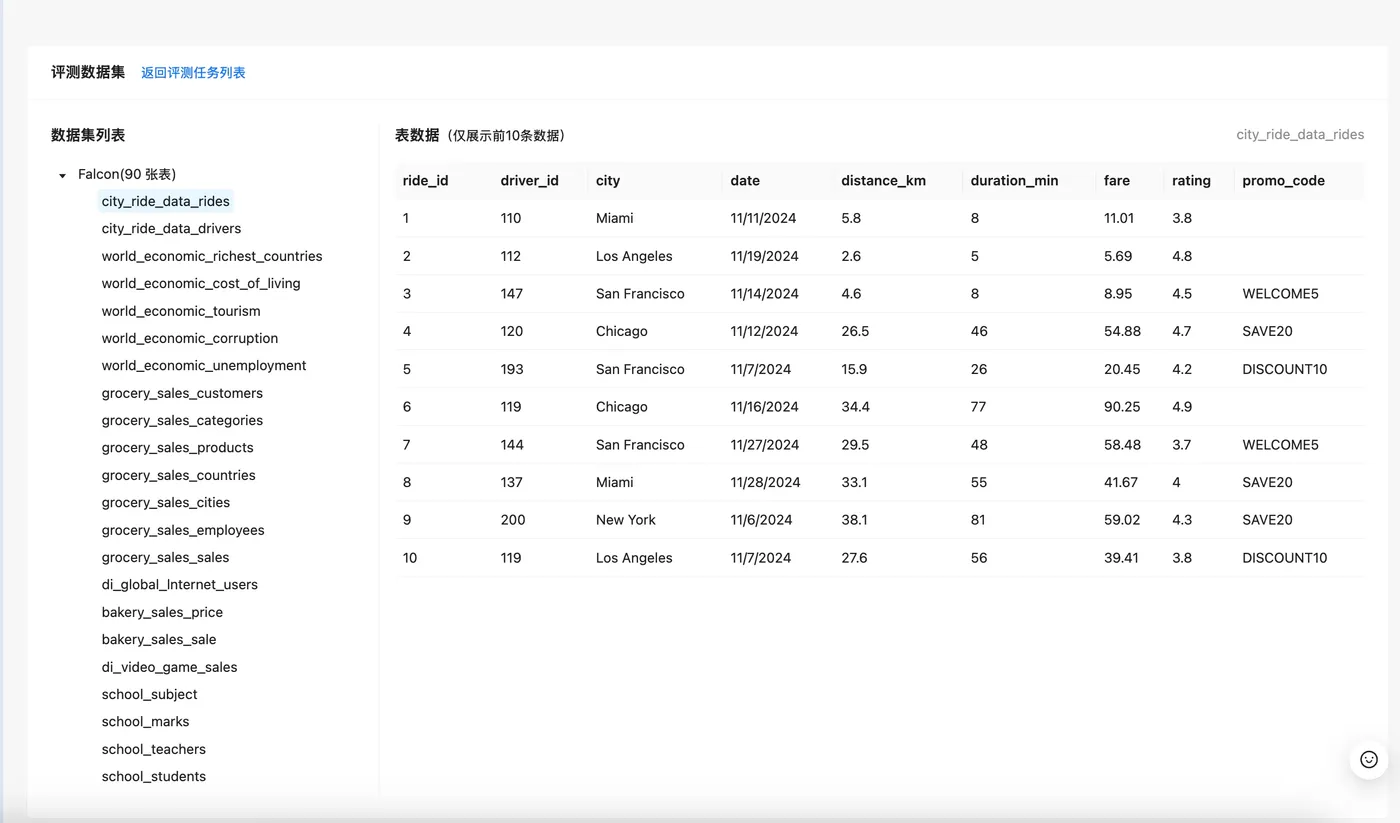 评测模块使用的Benchmark数据集:Falcon 是蚂蚁集团开源的一个不断发展的高质量Text2SQL数据集。