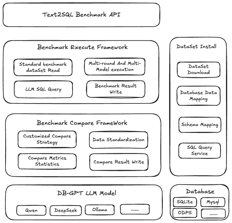 - 评测集结果对比框架:基于标准评测集和LLM SQL结果执行结果对比并汇总评测结果