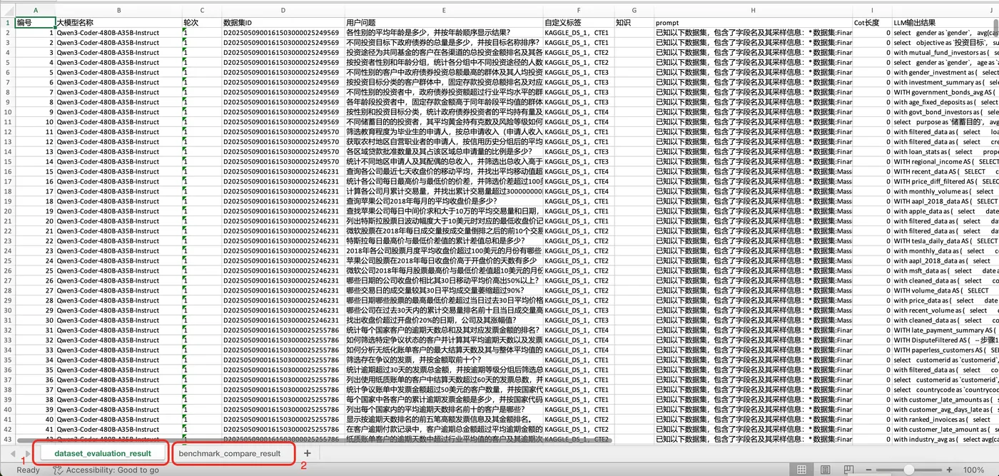 - 下载的Excel报告包含了评测任务LLM执行详情、评测对比结果等信息(通过不同Sheet展示)