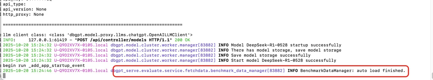 - 第二步:启动DB-GPT服务,等待评测集自动加载完成,看到这行日志表示评测集加载完成(大约 1~3 分钟左右)