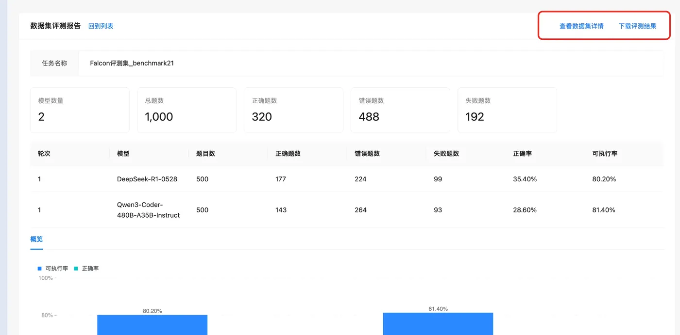 - 每轮、每个模型的执行结果:执行题目数、正确题目数、错误题目数、失败题目数、可执行率、正确率