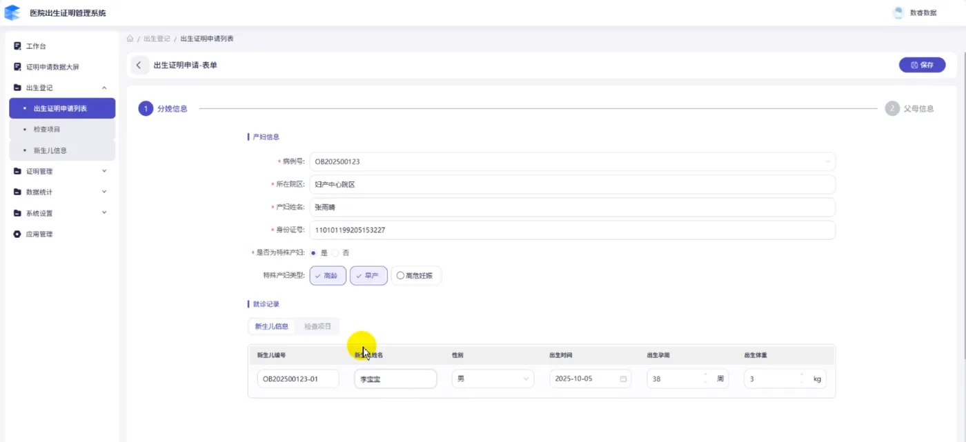• 分娩信息模块:记录产妇基本信息、新生儿信息、医疗团队情况等核心数据;