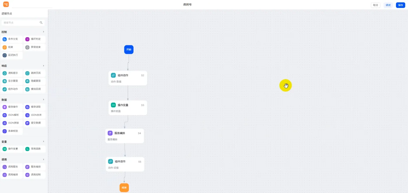 我们选中病例编号组件,配置交互事件,当选中选项后,系统将病例编号作为查询条件,在【新生儿信息】资产中查找相应数据,并填充至新生儿列表中。