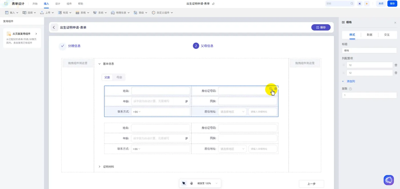 在“分娩信息”步骤中,进一步使用栅格布局与群组组件对字段进行归类和分组,确保界面整洁、逻辑清晰。