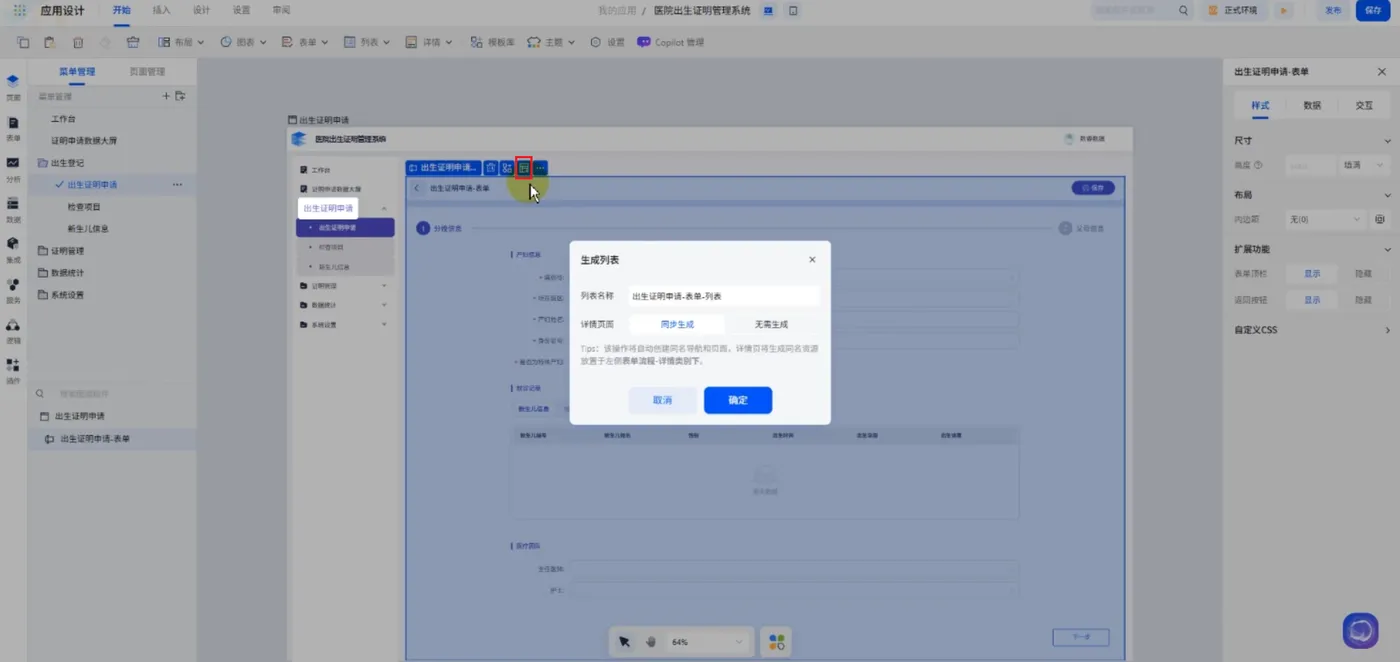 进入应用设计界面,新增【出生证明申请】菜单,拖入表单组件并双击进入配置。