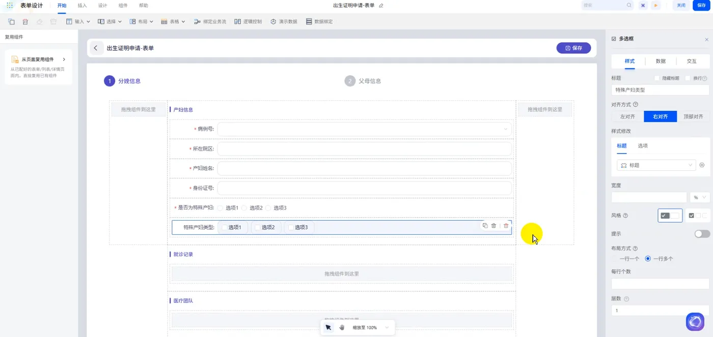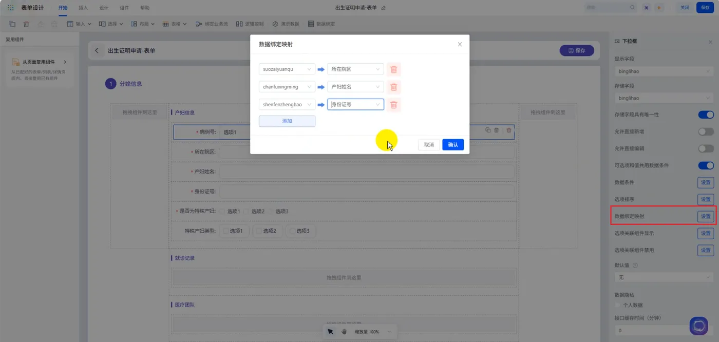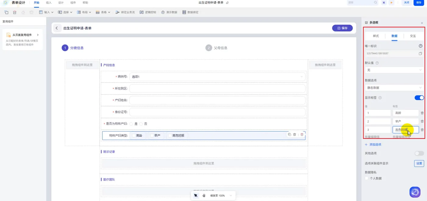 接下来,通过点击【数据绑定映射】,即可将选项关联的其他字段自动填充到表单的对应组件中。 单选或多选框,可快速配置选项数量和选项标签。 特殊产妇类型组件只有在用户选择【是】的时候才会显示,因此我们选中单选框组件,设置组件联动显示。