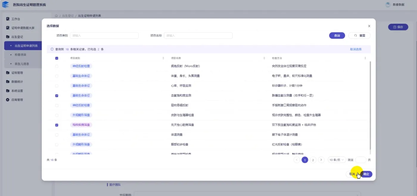 • 检查项目通过弹窗从已有列表选择,确保数据规范