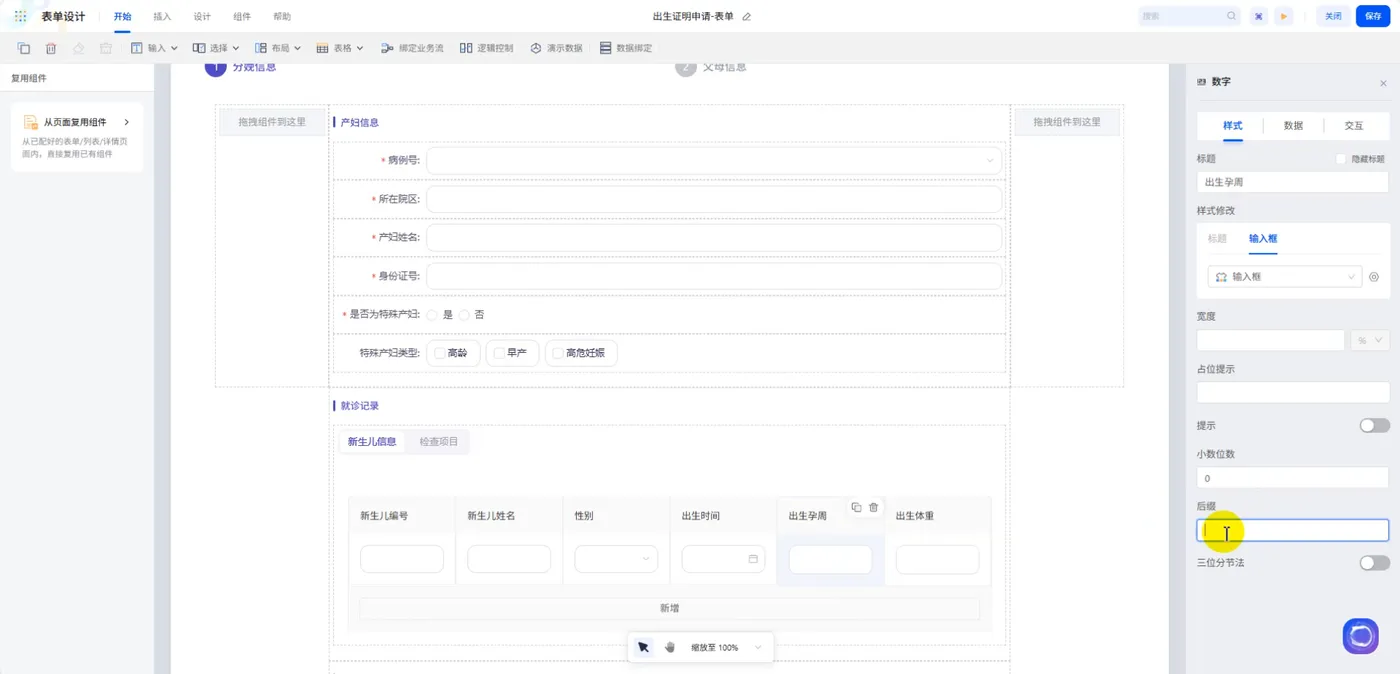 • 出生孕周(数字组件):在组件后缀中输入“周”。