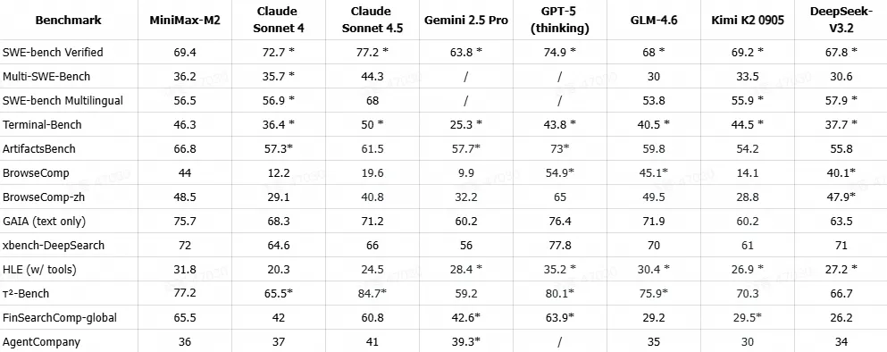 MiniMax-M2 在一系列强调端到端编码和智能体工具使用的基准测试中表现优异。这些任务(如 SWE-bench, Terminal-Bench, BrowseComp, HLE (w/ tools), FinSearchComp-global 等)的性能与开发者在终端、IDE 和 CI 中的日常体验高度相关。