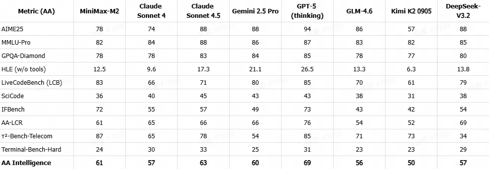 在 Artificial Analysis (AA) 综合智能基准测试中,MiniMax-M2表现卓越,总分位列全球开源模型榜首。该评测体系全面覆盖了模型在数学、科学与编码等多个核心领域的能力。