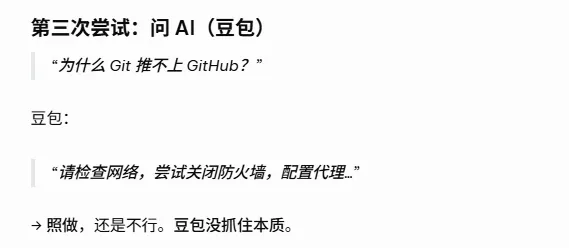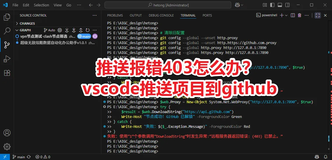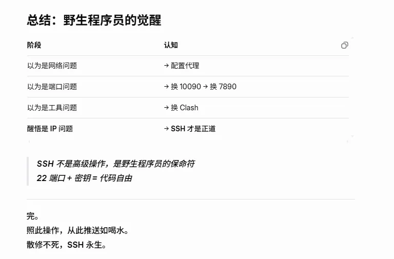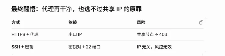 “你代理能上网,但 GitHub 403,说明 出口 IP 被封。 别折腾代理了,上 SSH。”