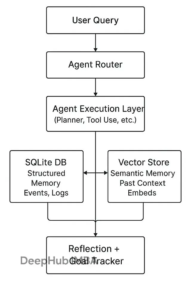 1、用户请求进来,Agent 执行任务,同时把交互记录写入 SQLite 和向量库。