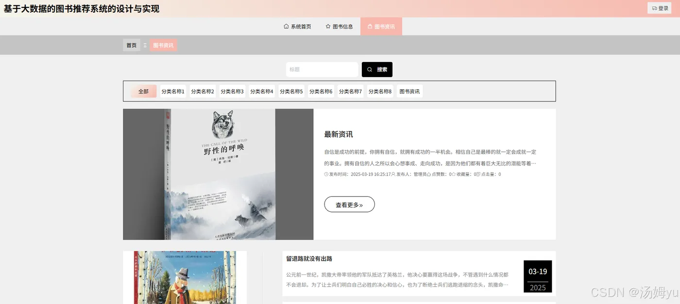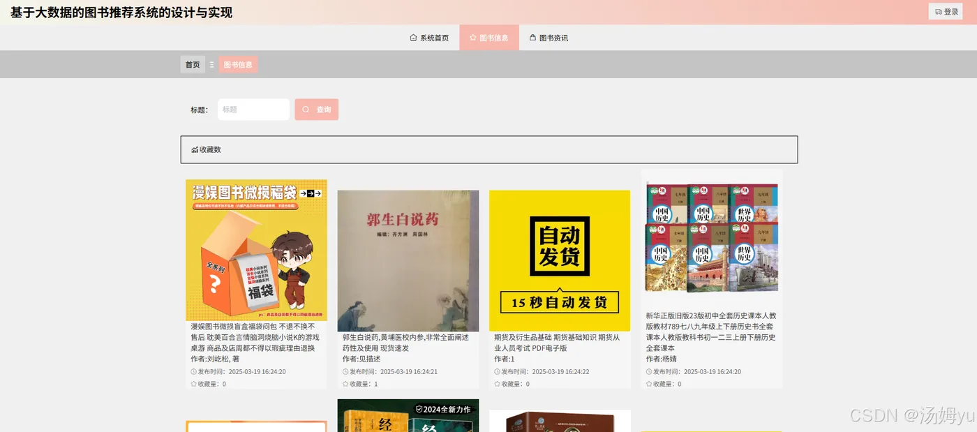 在信息繁杂的图书世界中,读者常常面临“书海难择”的困境。基于Python大数据的图书推荐和分析系统,能够深度挖掘读者的阅读历史、搜索偏好、评价反馈等多维度数据,运用先进的算法模型为读者精准推荐符合其兴趣和需求的图书。这种个性化推荐打破了传统推荐方式的局限,让读者无需在海量图书中盲目搜寻,节省了时间和精力,能够更快地找到心仪的书籍,从而极大地提升了阅读的便捷性和愉悦感,激发读者的阅读兴趣,促进阅读行为的持续发生。