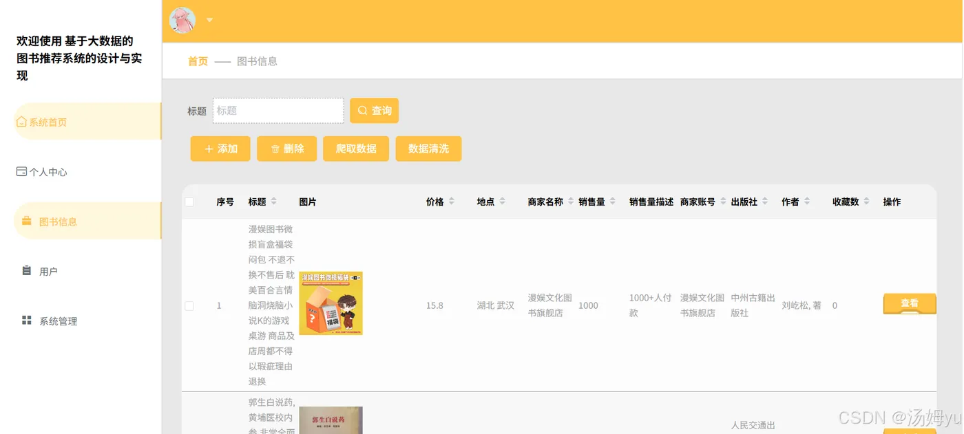 在当今数字化信息爆炸的时代,图书资源呈现出前所未有的丰富性与多样性。图书馆、在线阅读平台等汇聚了海量的图书,涵盖各个学科、各种题材和风格。然而,面对如此庞大的图书库存,读者在挑选适合自己的书籍时往往感到无从下手,传统的图书检索方式已难以满足读者快速精准获取心仪图书的需求。与此同时,大数据技术正蓬勃发展并深刻改变着众多行业。大数据能够从海量、复杂的数据中挖掘出有价值的信息和规律,为决策提供有力支持。Python作为一种功能强大且易于使用的编程语言,在大数据处理领域具有显著优势。它拥有丰富的数据处理库,如Pandas用于数据清洗和预处理,NumPy用于高效的数值计算,Scikit - learn用于机器学习算法实现等,能够轻松应对大数据分析中的各种任务。将Python大数据技术应用于图书领域,构建图书推荐和分析系统具有重要的现实意义。通过收集读者的阅读历史、搜索记录、评价反馈等多维度数据,利用大数据分析和机器学习算法,可以深入了解读者的阅读偏好和需求,为其提供个性化的图书推荐。此外,系统还能对图书的流行趋势、读者群体的阅读行为等进行分析,为出版社的选题策划、图书馆的馆藏建设提供参考依据。因此,开展基于Python大数据的图书推荐和分析系统研究,是顺应时代发展潮流、满足读者需求、推动图书行业智能化发展的必然选择。