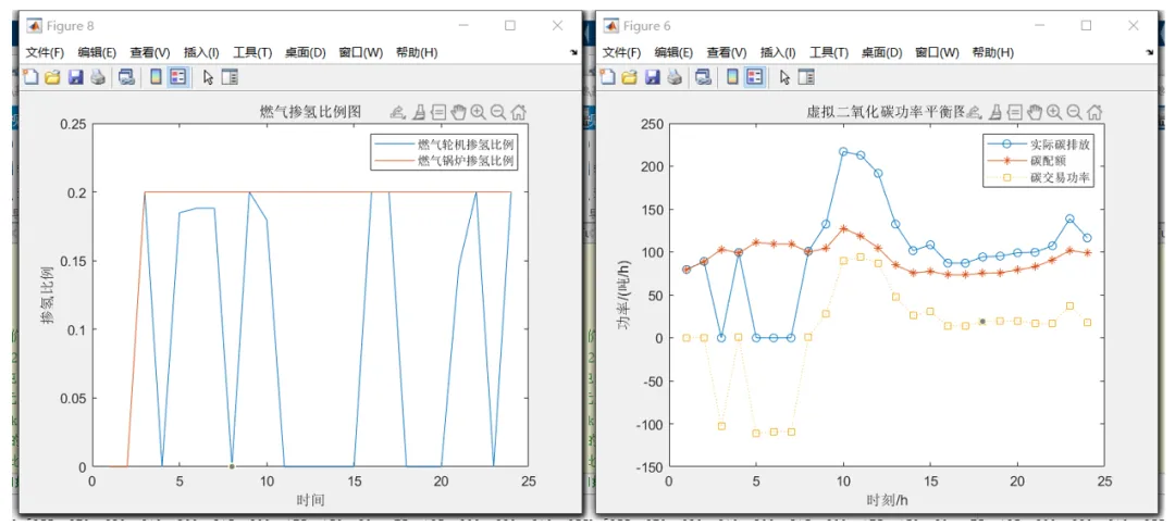 - 能源生产单元:新能源机组为100MW风电 + 80MW光伏,出力数据采用历史实测数据与Weibull分布模拟;燃气掺氢机组额定功率60MW,掺氢比例可在15%-30%调节(掺氢量提升1%可降低碳排放2.3%);储能系统为20MW/80MWh锂电池储能,充放电效率90%,SOC约束为20%-90%。