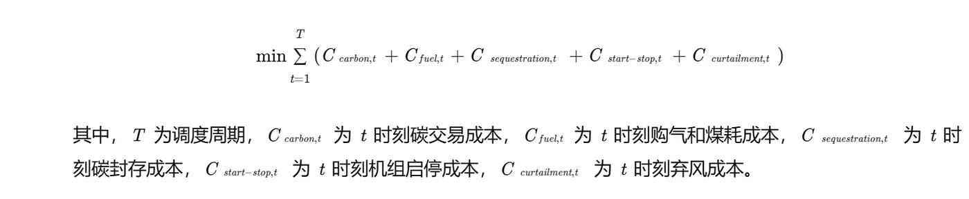 本文提出的优化调度策略以总运行成本最小为目标函数,总成本包括碳交易成本、购气和煤耗成本、碳封存成本、机组启停成本和弃风成本之和。目标函数可表示为: