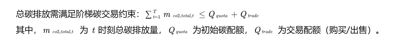 阶梯碳交易机制根据碳排放量的不同,设置不同的碳交易价格,从而对碳排放进行约束。假设碳价设计为:根据碳排放量划分阶梯区间,碳排放越低,单位碳价越低(如基准价200元/吨,每降低10%碳排放,碳价下降10%)。清算机制为按小时记录碳配额与实际排放,周期结束时按阶梯价格清算。约束条件为总碳排放 ≤ 初始配额 + 交易配额(购买/出售)。