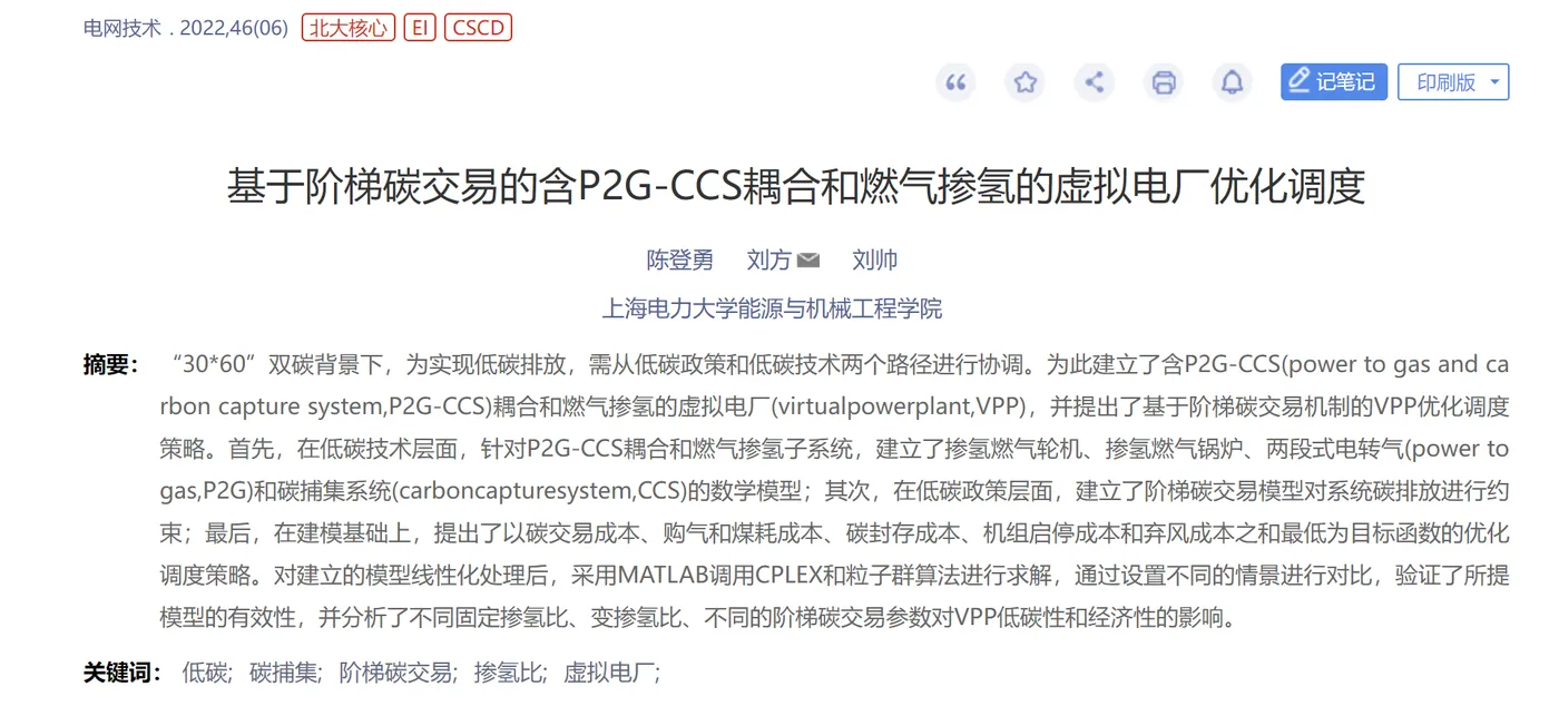 P2G(Power-to-Gas)技术可将富余电能转化为天然气,实现风光消纳与能源存储;CCS(Carbon Capture and Storage)技术能捕获燃气发电产生的二氧化碳,减少碳排放;燃气掺氢技术则通过降低燃气中的碳含量,直接削减燃烧过程的碳排放。将P2G-CCS耦合、燃气掺氢技术与阶梯碳交易机制相结合,应用于虚拟电厂优化调度,对实现“碳达峰、碳中和”目标具有重要的理论与实践意义。