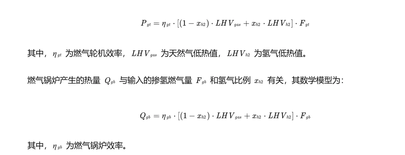 掺氢燃气轮机与锅炉是虚拟电厂中的关键组成部分。在建模过程中,需考虑氢气与天然气的混合比例,以及不同工况下的运行效率。假设燃气轮机输出功率 Pgt 与输入的掺氢燃气量 Fgt 以及氢气比例 xh2 相关,其数学模型可表示为: