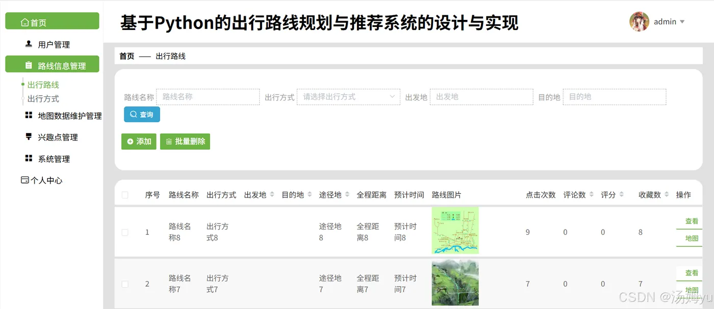 在快节奏的现代生活中,时间就是效率。基于Python的出行路线规划推荐与分析系统,能综合实时交通数据、不同出行方式成本及个人偏好等多维度信息,为用户精准规划最优路线。对于日常通勤者,可避开拥堵路段,大幅缩短通勤时间,减少因堵车带来的焦虑与疲惫;对于商务出行人士,能确保准时抵达会议地点,提升商务活动的顺利进行概率;旅游者则可借助系统发现风景优美且人少的特色路线,丰富旅行体验。这种个性化、智能化的路线规划,让出行更加轻松、高效,满足人们多样化的出行需求。