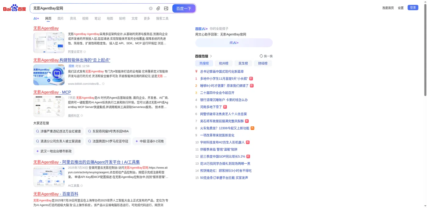 - 百度搜索结果页截图 - 展示了搜索"无影AgentBay官网"后的结果页面