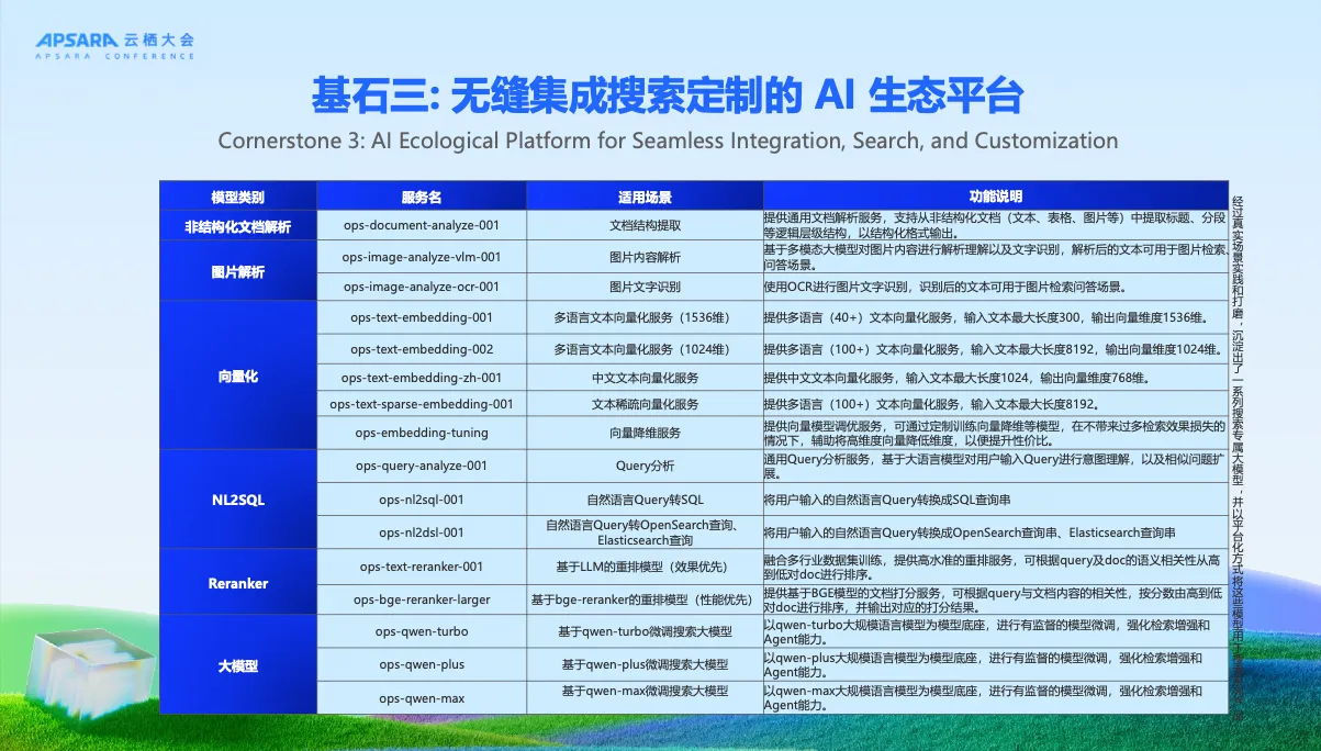 - 无缝集成 AI 平台:无缝集成阿里云 AI 搜索开放平台,提供丰富的搜索专属大模型。这并非通用模型,而是经过大量真实搜索场景打磨的专属模型,让检索和生成效果更专业。