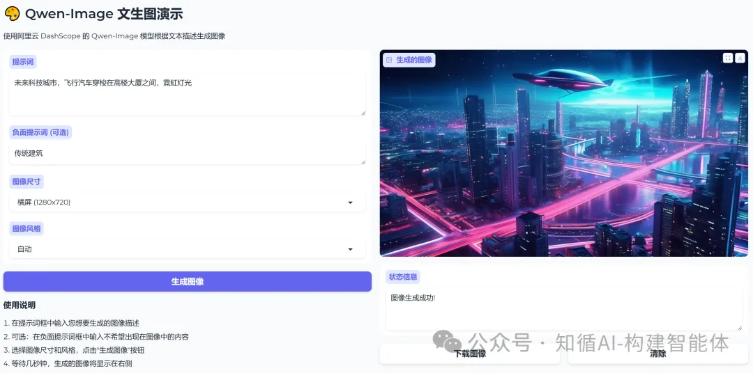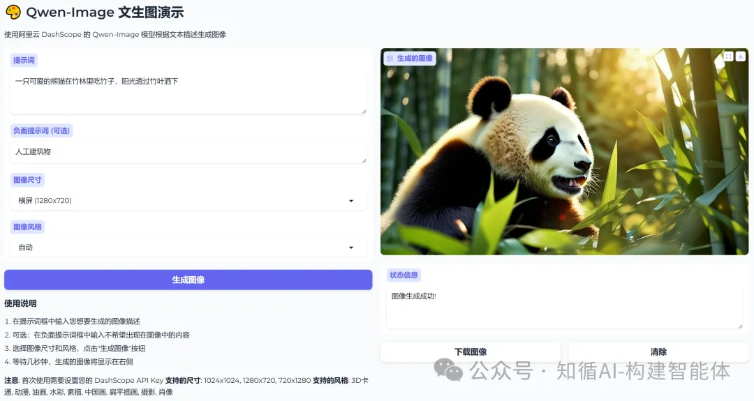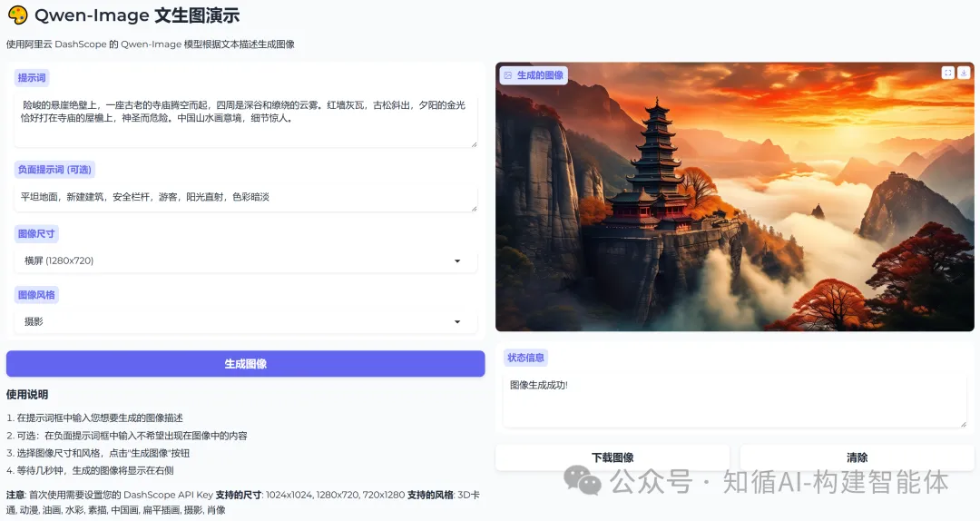 - 辅助功能:提供示例提示词、图像下载和状态显示等功能