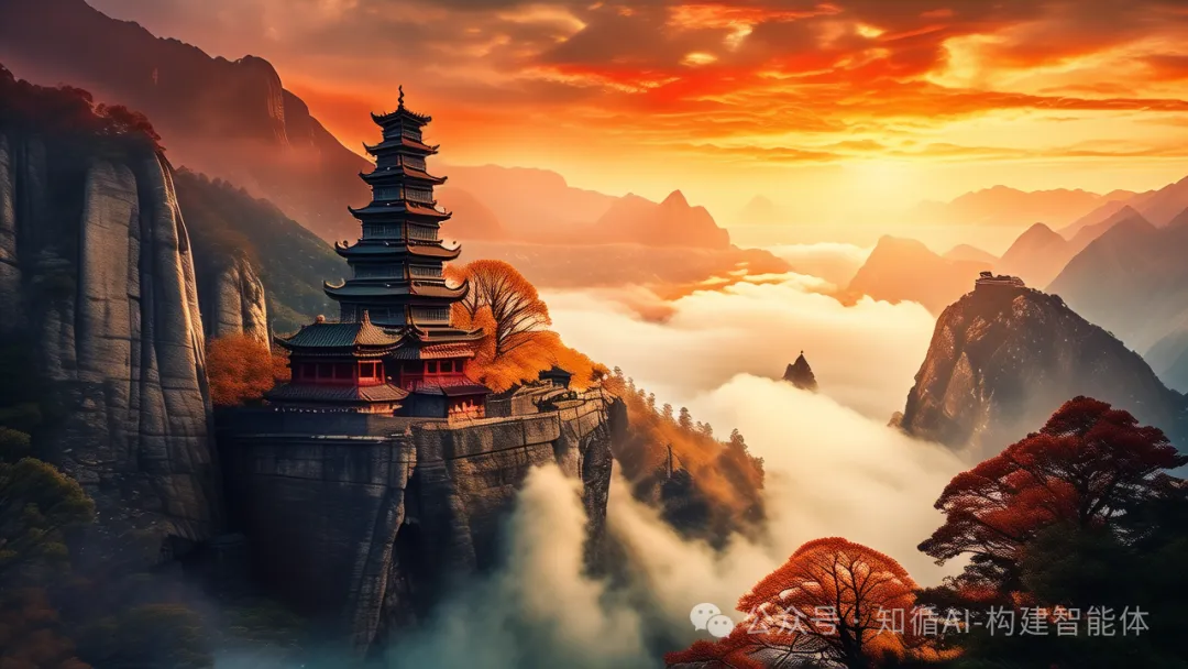 4. 提示词:险峻的悬崖绝壁上,一座古老的寺庙腾空而起,四周是深谷和缭绕的云雾。红墙灰瓦,古松斜出,夕阳的金光恰好打在寺庙的屋檐上,神圣而危险。中国山水画意境,细节惊人。