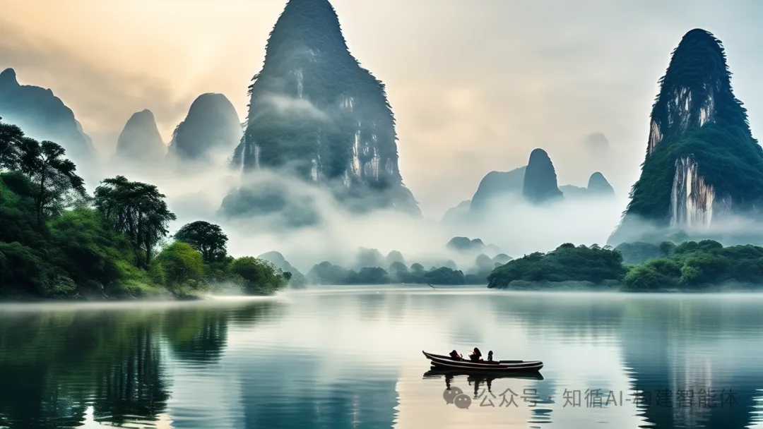 2. 提示词:中国桂林漓江,春雨后,雾气缭绕如薄纱,江面如镜,倒映着喀斯特地貌的翠绿山峰。一叶扁舟点缀江心,远处山峦层层叠叠,意境如水墨画般诗意朦胧。柔和散射光,宁静氛围。