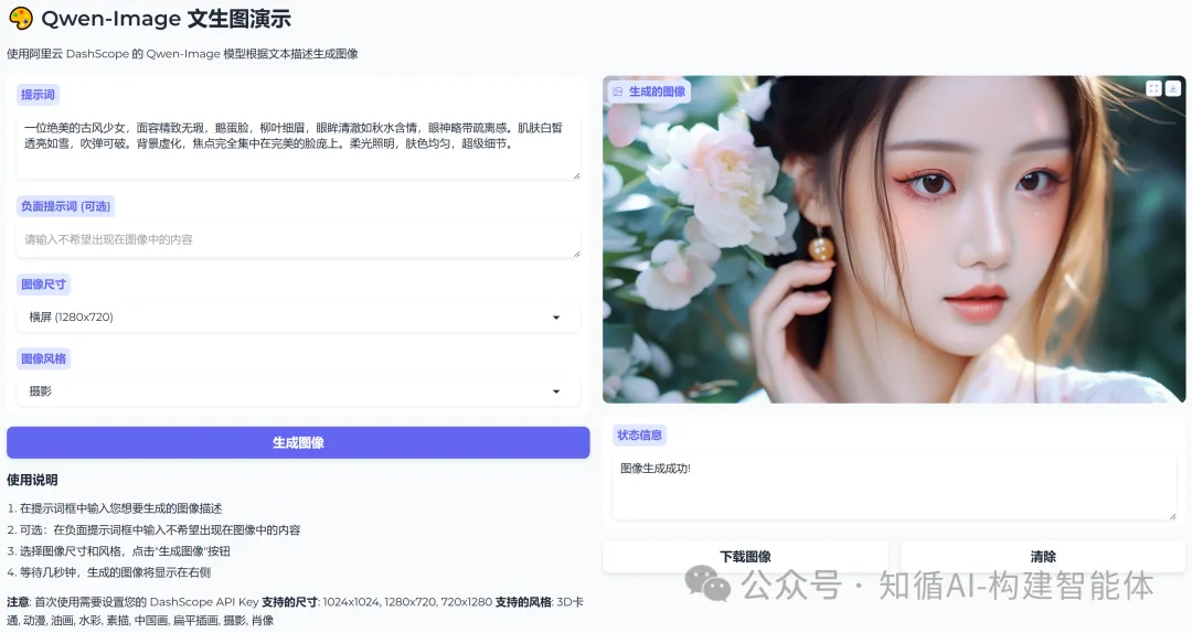 - API 调用封装:通过 HTTP 请求直接调用 DashScope Qwen-Image API,支持异步任务处理和轮询机制