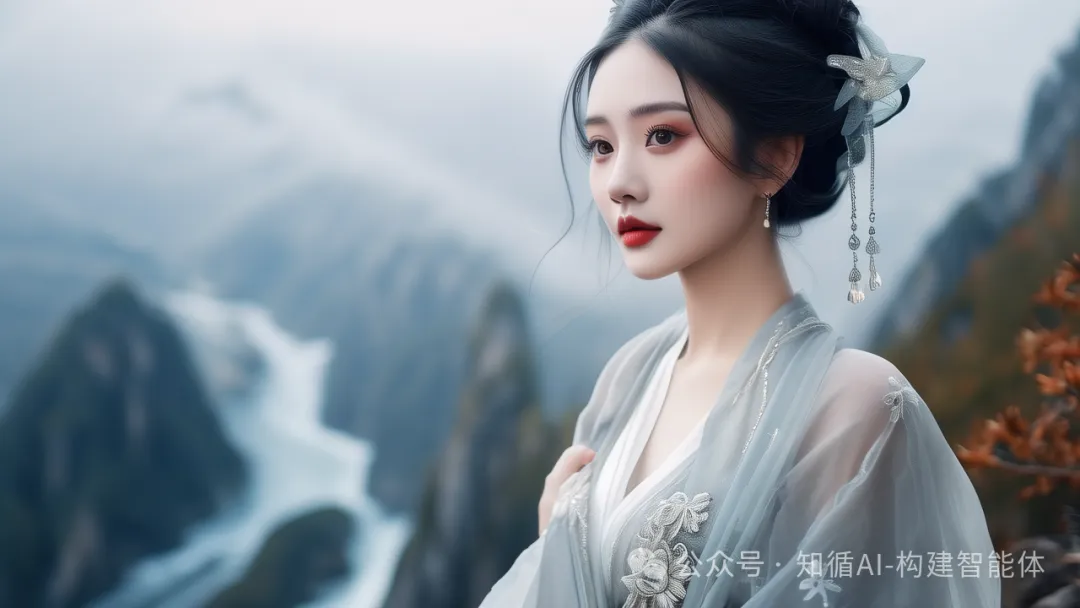 1. 提示词:一位绝美的仙侠古风女子,面容精致无瑕,肌肤胜雪,淡妆容,眼眸如秋水含情。身着飘逸的雪纱汉服,衣袂飘飘,上有淡淡的青莲暗纹,发丝边缘闪烁着柔光,站在云雾缭绕的仙境山巅。大师级摄影,胶片质感,超高细节,8K分辨率。