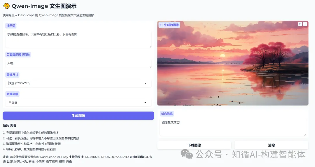 经过今天的部署,我们能构建了一个功能完整、用户友好的Web应用程序,通过Gradio界面连接Qwen-Image模型实现了从文本描述生成高质量图像的功能。使用前务必将 DASHSCOPE_API_KEY 替换为阿里云平台获取的真实密钥。