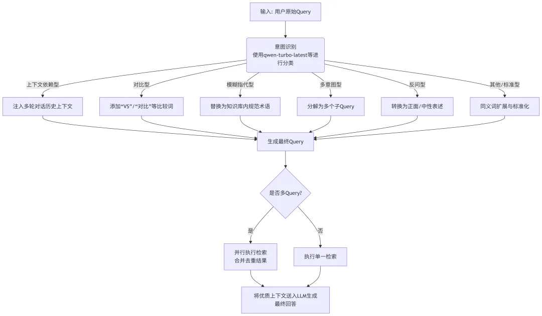 2. 核心决策点(意图识别):首先使用 qwen-turbo-latest 等模型对Query进行意图分类。这是整个流程的“大脑”,决定了后续的改写策略。常见的意图类别包括:定义、操作、对比、故障排除等。