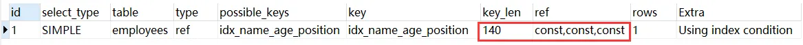 示例表: CREATE TABLE `employees` ( `id` int(11) NOT NULL AUTO_INCREMENT, `name` varchar(24) NOT NULL DEFAULT '' COMMENT '姓名', `age` int(11) NOT NULL DEFAULT '0' COMMENT '年龄', `position` varchar(20) NOT NULL DEFAULT '' COMMENT '职位', `hire_time` timestamp NOT NULL DEFAULT CURRENT_TIMESTAMP COMMENT '入职时间', PRIMARY KEY (`id`), KEY `idx_name_age_position` (`name`,`age`,`position`) USING BTREE ) ENGINE=InnoDB AUTO_INCREMENT=4 DEFAULT CHARSET=utf8 COMMENT='员工记录表'; INSERT INTO employees(name,age,position,hire_time) VALUES('LiLei',22,'manager',NOW()); INSERT INTO employees(name,age,position,hire_time) VALUES('HanMeimei', 23,'dev',NOW()); INSERT INTO employees(name,age,position,hire_time) VALUES('Lucy',23,'dev',NOW());